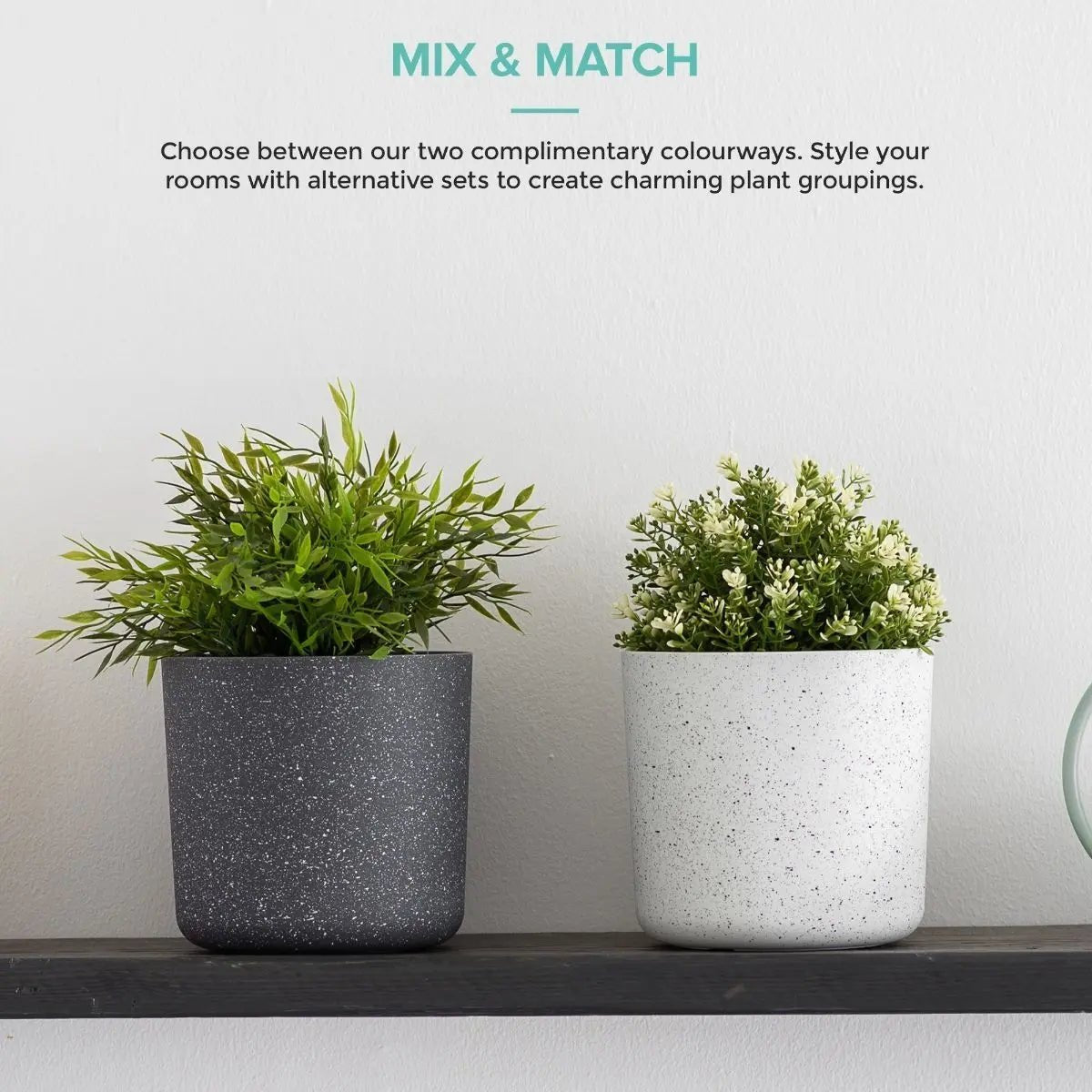 The weather-resistant quality of the plastic is built to withstand harsh seasonal weather, giving you confidence knowing that these pots will not be damaged if left in your garden. UNIQUE SPECKLED EFFECT- Present your flowers with our Scandi inspired pots that feature a speckled effect in natural tones. SAFE- The flowerpot comes with an embossed base meaning wherever you decide to place it, you do not have to worry about damaging any delicate surfaces. The elevated base allows air circulation, this will enable moisture to evaporate from beneath the pot. The pot is watertight, however, a central guide features on the base to allow the user to drill a drain hole if desired 2 COLOURS – Available in two wonderful colours, Grey and White. Both colours are aesthetically pleasing and fit with any décor or outdoor space. DIMENSIONS – Flowerpot sizes vary between 18cm and 22cm