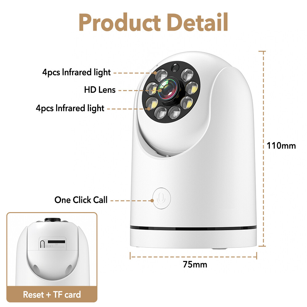 5G IP Camera Baby Monitor WiFi Indoor Wireless Surveillance Pet Camera Auto Tracking PTZ Security Camera with 32GB Card Features: 2.2-Way Audio: The security camera indoor wireless is equipped with a built-in mic & speaker. Talk and listen to the courier, baby, or pet via this baby monitor with camera and audio. If your baby cries, you will be able to comfort your baby even if you are in the office. 3.Real-time Detection & Instant Alert & Message Push: When you turn on the motion detection switch, sound detection switch, alarm message push switch and warning sound switch, once indoor camera detects motion or sound, the indoor camera will sound an alarm and your phone will receive a message push. You can also customize the detection sensitivity (high, medium, low) of the wifi camera, which can reduce false alarms by 90%! 4.Smart Auto Tracking: Indoor security camera has automatic tracking function, when motion is detected, 360 degree security camera will automatically track and follow moving objects; and record the moving objects. 5.Support 5G/2.4G WiFi: The wifi camera supports 5G and 2.4G WiFi networks. It can be controlled remotely by free APP "iCam365". Just power on and reset, connect it to your WiFi network, and you can set it up quickly and easily in minutes. 6.360° Panoramic Surveillance: Indoor security camera can rotate a 355° pan and 110° tilt range to achieve a 360-degree view through the app, without blind spots. 7.Secure Cloud & Micro SD Card Storage: Our pet camera indoor supports sd card storage and cloud storage. If you want to keep the video, you can save it to micro SD or cloud according to your choice. The cloud storage feature requires an additional subscription. 8.Clear Color Night Vision: 4 infrared lights and 4 floodlights, it supports infrared/full color/auto(smart) 3 night vision modes. Specification: