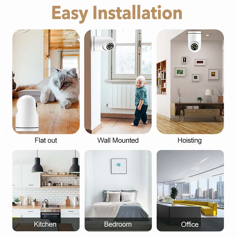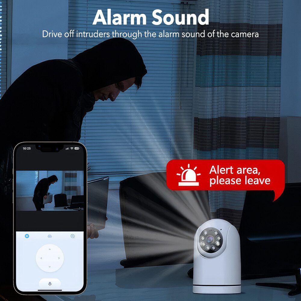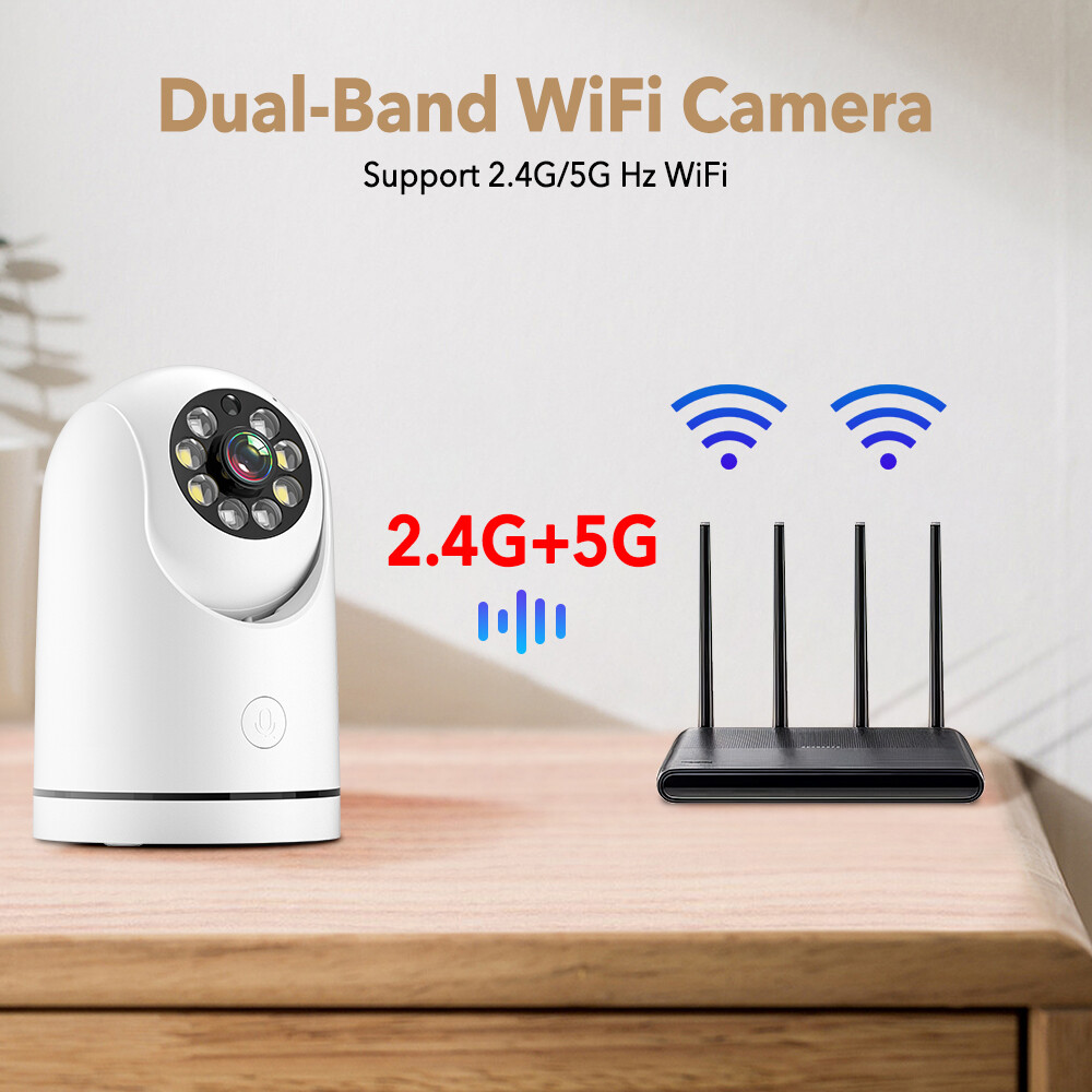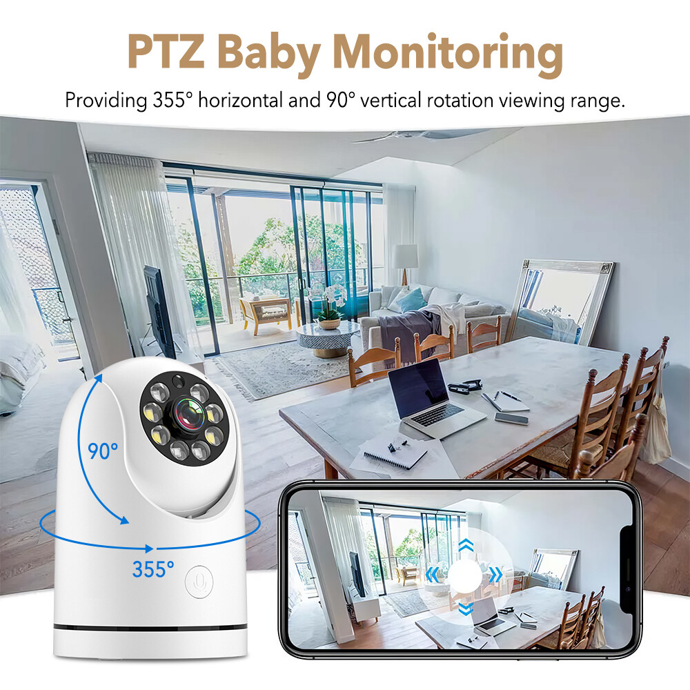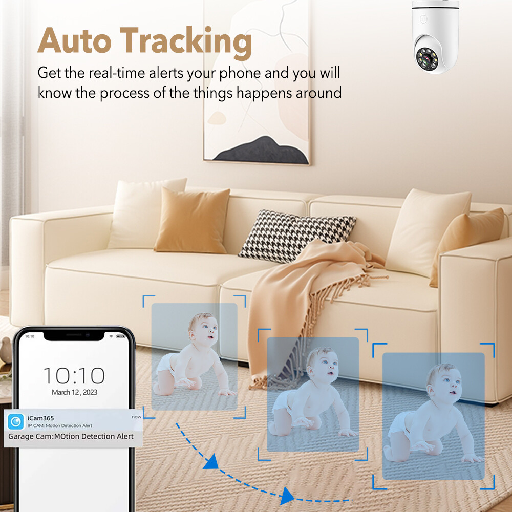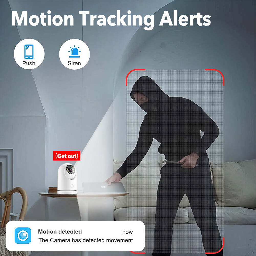 Enhanced Security and Peace of Mind Easily keep an eye on your little ones, elderly family members, or pets with the 5G WiFi IP Camera Baby Monitor. With built-in auto-tracking, 2-way audio, and real-time notifications, this camera lets you stay connected to your home from anywhere. This powerful indoor surveillance device also features a 360° pan and tilt function, giving you a full view of every room.