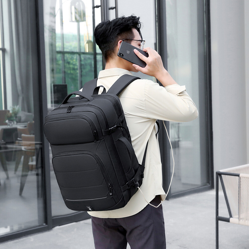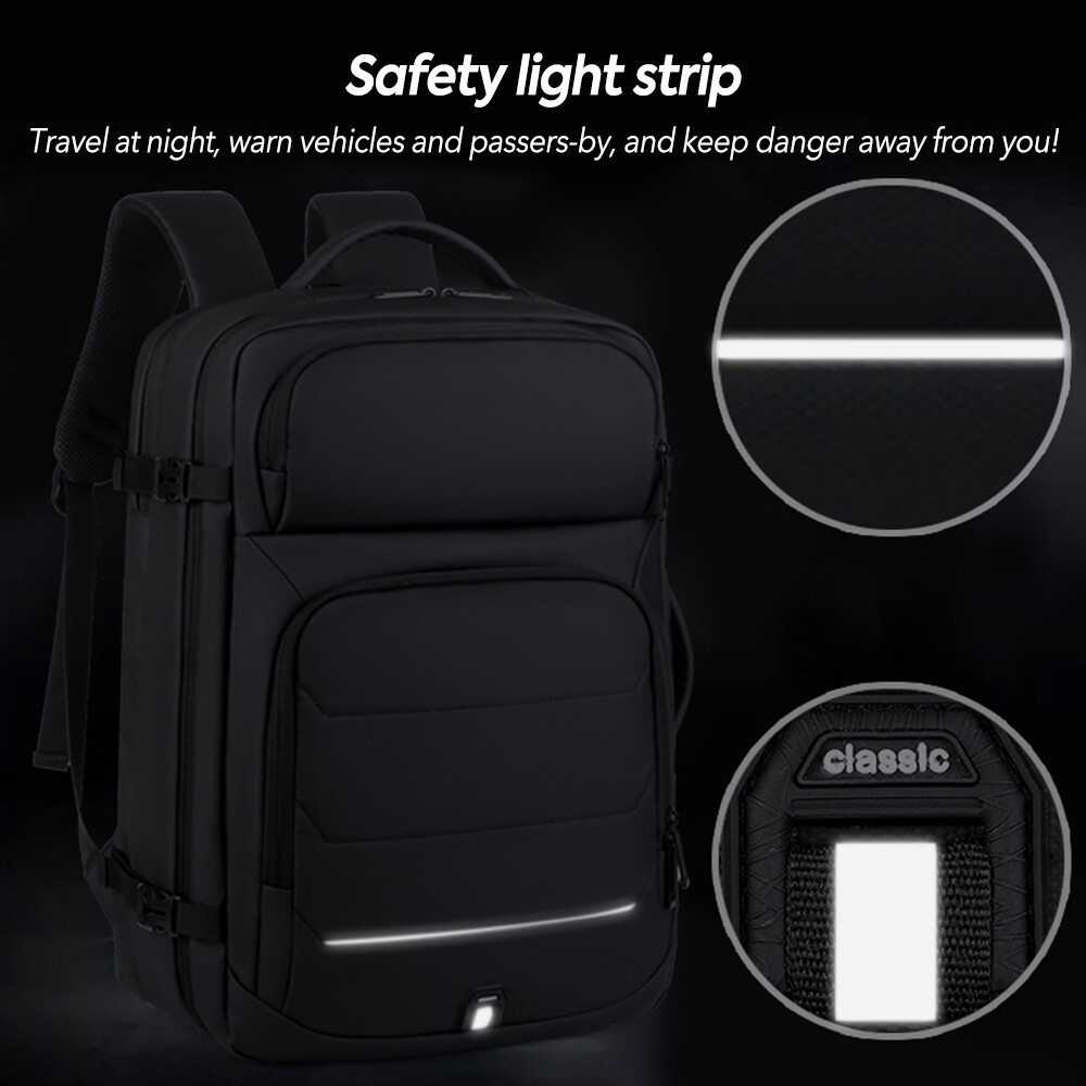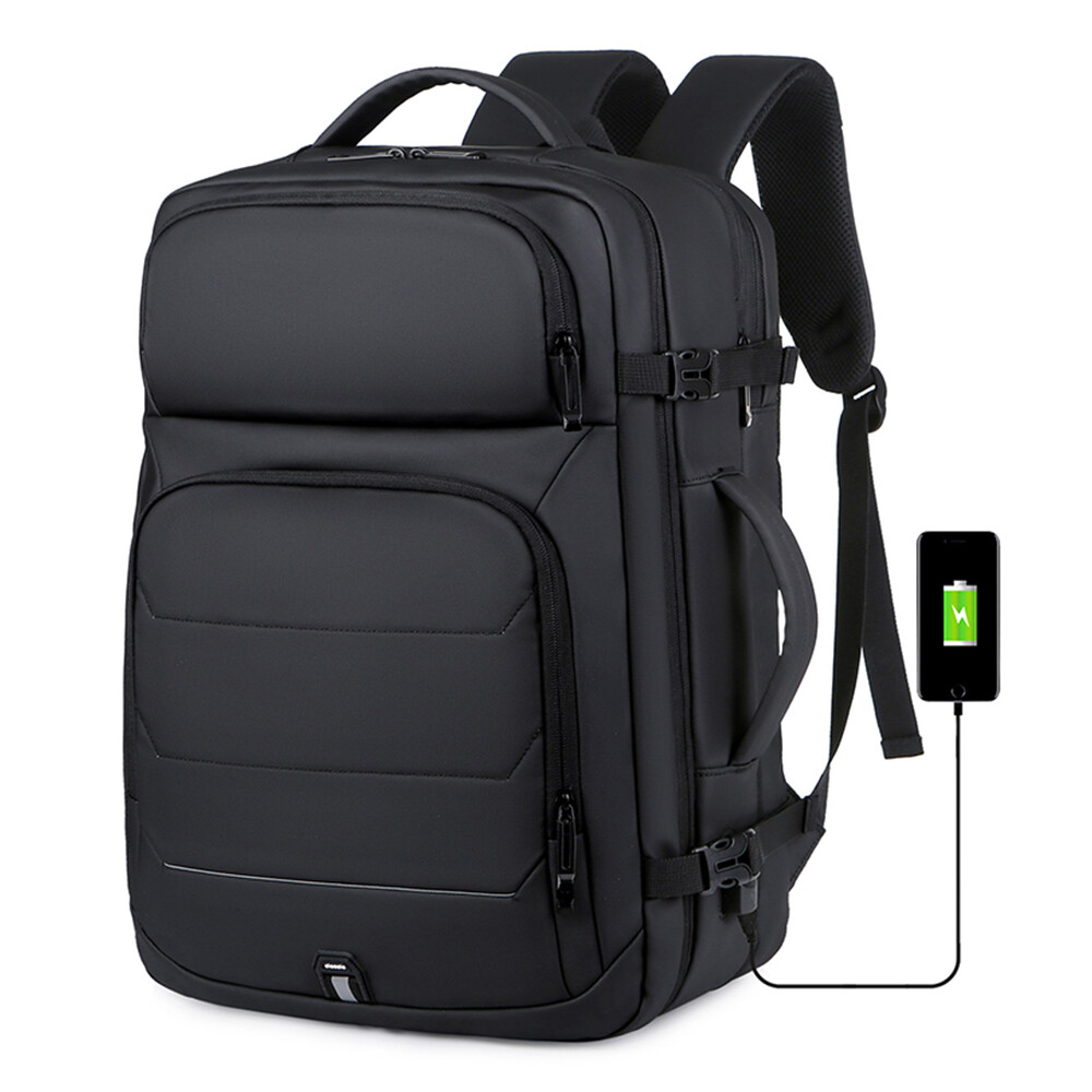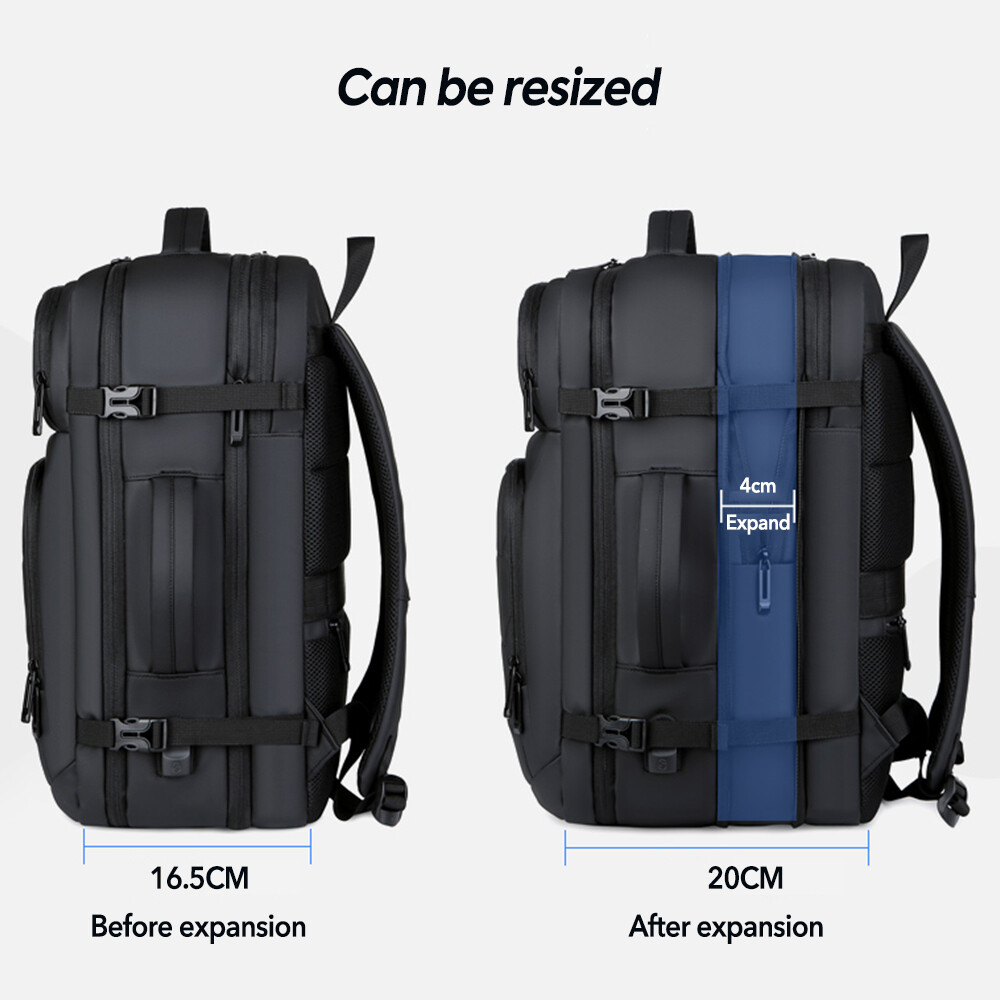 50L Expandable Travel Backpack TSA Flight Approved Laptop Backpack Weekender School Bag with USB Charging Port Features: 2.26-50L Expandable and Large Capacity:This extra large travel backpack with expandable feature offers you more packing capacity.Before expand,the carry on backpack size is:18x14x6.5 inch;after expand,size is 18x14x8 inch.Weight:1.9 Ib (900g) 3.Multi Compartment:The main compartment can hold your travel goods,fit 5-8pcs clothes;Front compartment can also hold magazines,Ipad and books and power bank which can charge your phone;17.3 inch laptop compartment with padded. 4.Durable Travel Backpack: The shoulder and handle joints are adopted bold line sewing to make it sturdier. The fabric is made of high density scratch resistant and water repellent polyester, and strengthens the key points of force, which provide more durable backpack with lockable zipper heads. 5.Dual Handles: The two thick handles are comfortable for long time carrying. A great companion for commuting, business trip, hiking, travel, camping and other outdoor activities. 6.Waterproof&USB Port:Selection of high quality water-repellent nylon and breathable, abrasion-resistant microfiber faux leather. Little rain or water drops will not penetrate the bag.This premium travel backpack provide USB charging port with built-in charging cable which is easily to charge your smart phone while you are traveling