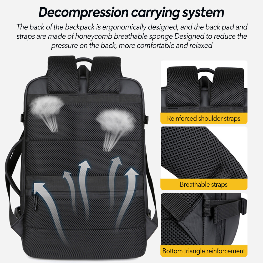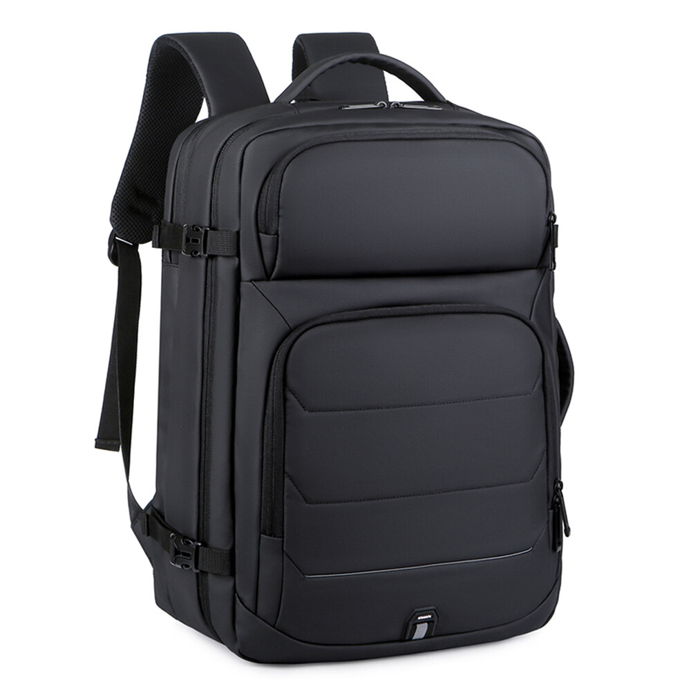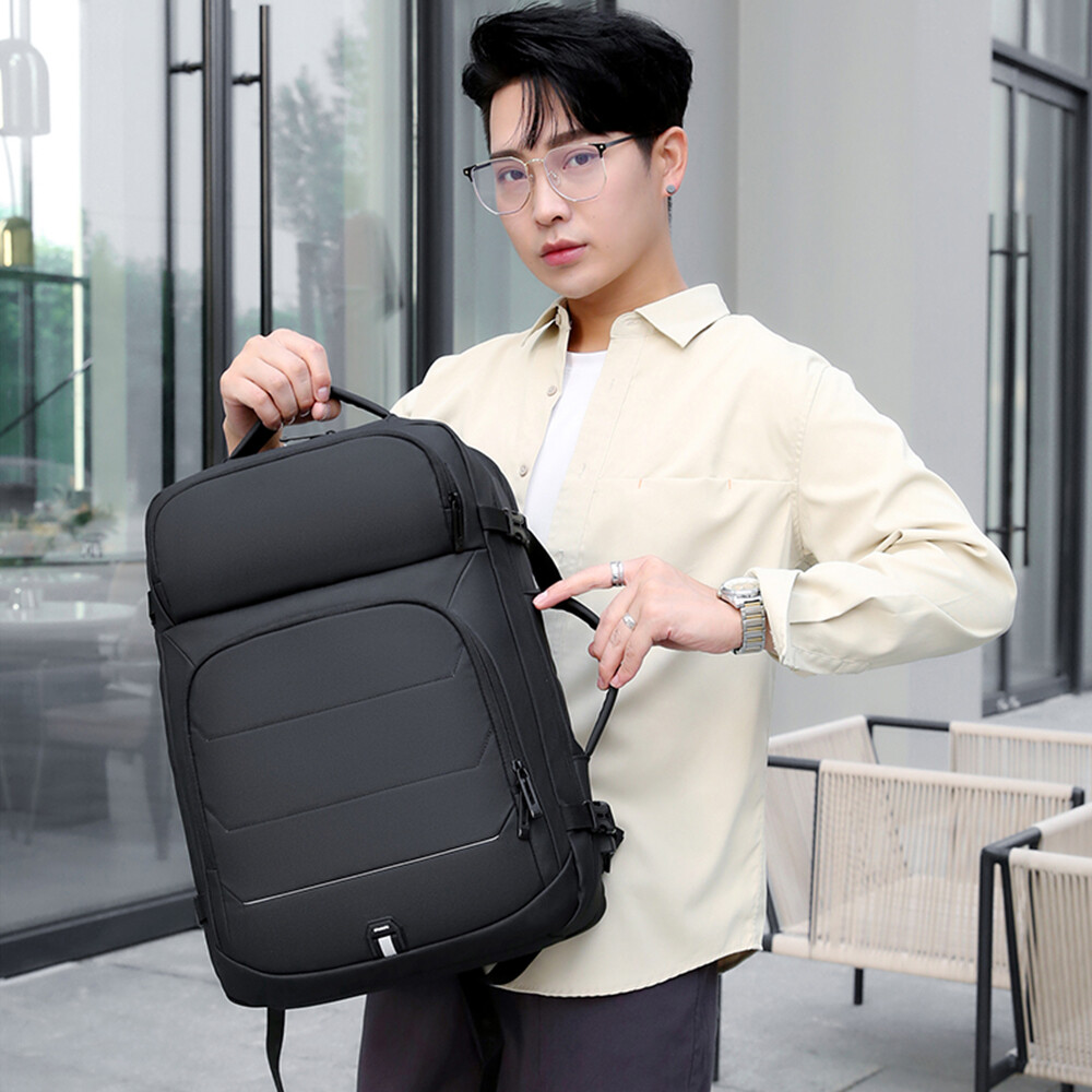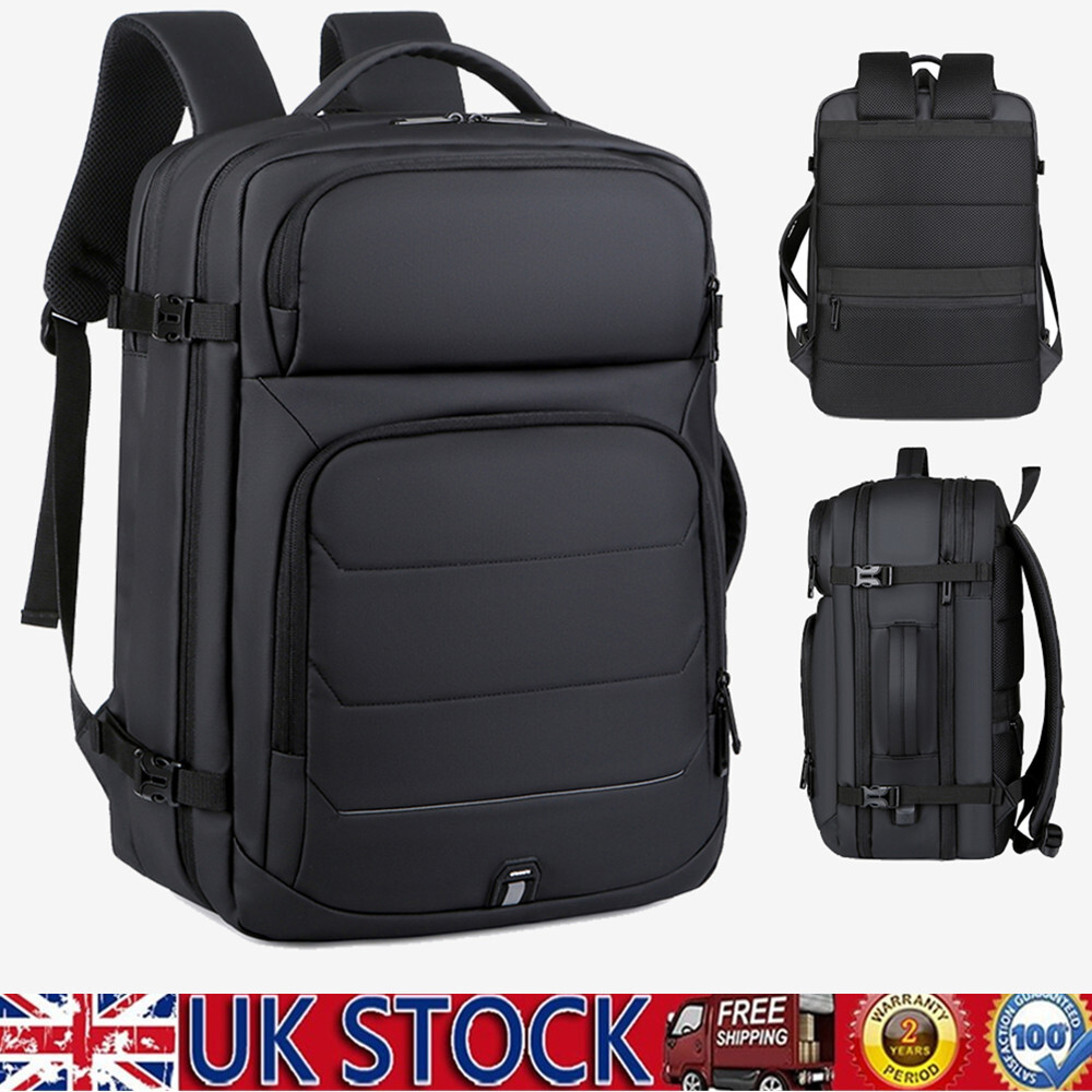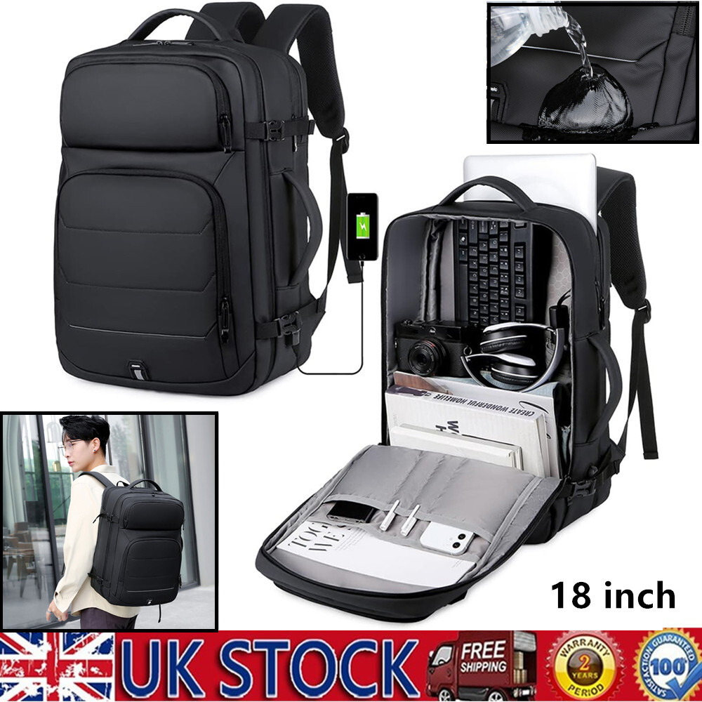 50L Expandable Travel Backpack TSA Flight Approved Laptop Backpack Weekender School Bag with USB Charging Port Features: 2.26-50L Expandable and Large Capacity:This extra large travel backpack with expandable feature offers you more packing capacity.Before expand,the carry on backpack size is:18x14x6.5 inch;after expand,size is 18x14x8 inch.Weight:1.9 Ib (900g) 3.Multi Compartment:The main compartment can hold your travel goods,fit 5-8pcs clothes;Front compartment can also hold magazines,Ipad and books and power bank which can charge your phone;17.3 inch laptop compartment with padded. 4.Durable Travel Backpack: The shoulder and handle joints are adopted bold line sewing to make it sturdier. The fabric is made of high density scratch resistant and water repellent polyester, and strengthens the key points of force, which provide more durable backpack with lockable zipper heads. 5.Dual Handles: The two thick handles are comfortable for long time carrying. A great companion for commuting, business trip, hiking, travel, camping and other outdoor activities. 6.Waterproof&USB Port:Selection of high quality water-repellent nylon and breathable, abrasion-resistant microfiber faux leather. Little rain or water drops will not penetrate the bag.This premium travel backpack provide USB charging port with built-in charging cable which is easily to charge your smart phone while you are traveling