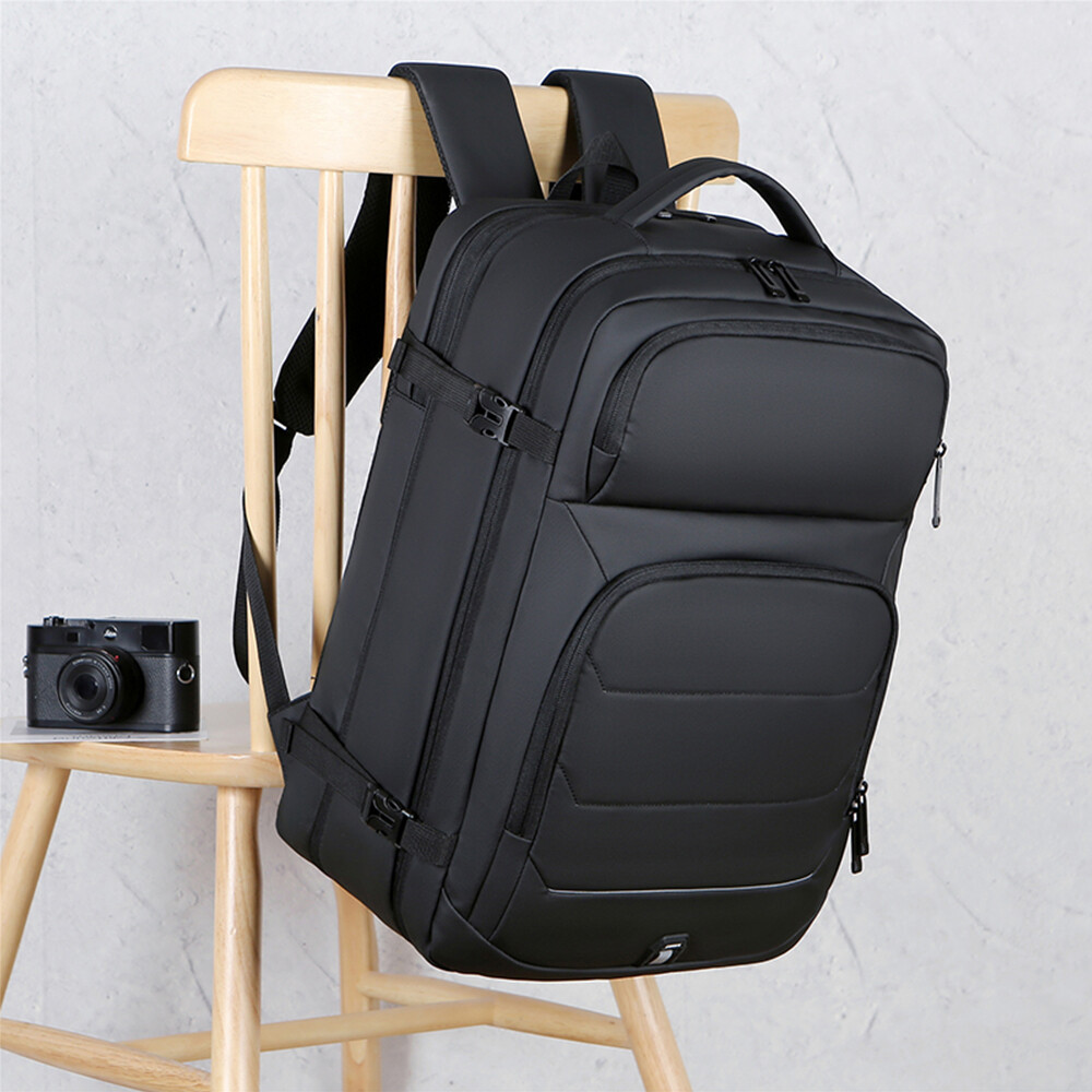 2.26-50L Expandable and Large Capacity:This extra large travel backpack with expandable feature offers you more packing capacity.Before expand,the carry on backpack size is:18x14x6.5 inch;after expand,size is 18x14x8 inch.Weight:1.9 Ib (900g)