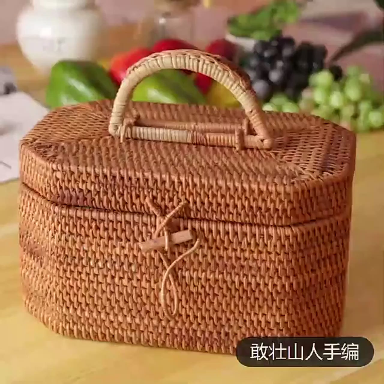 Handwoven Rattan Storage Box with Handle Wicker Ornament Box Tea Food Container Picnic Bread Fruit Cake Basket Kitchen Organizer