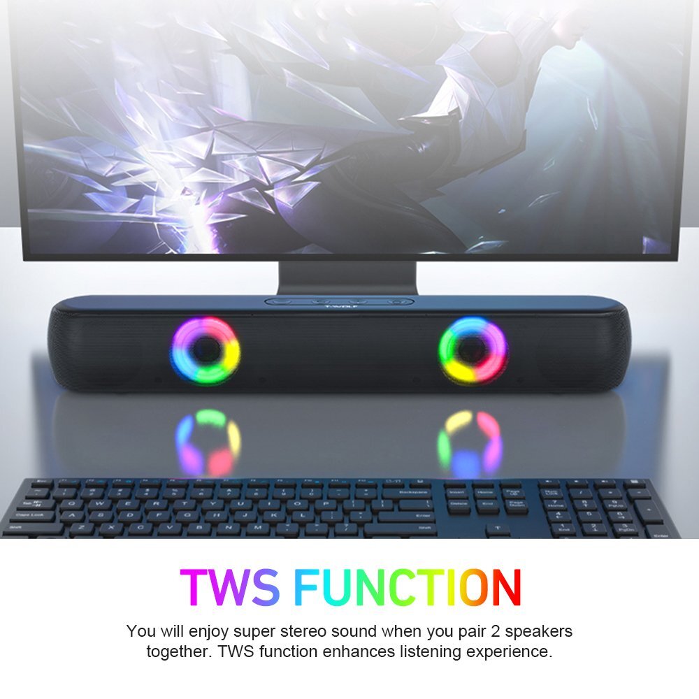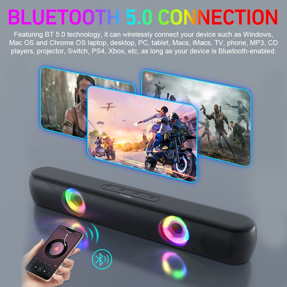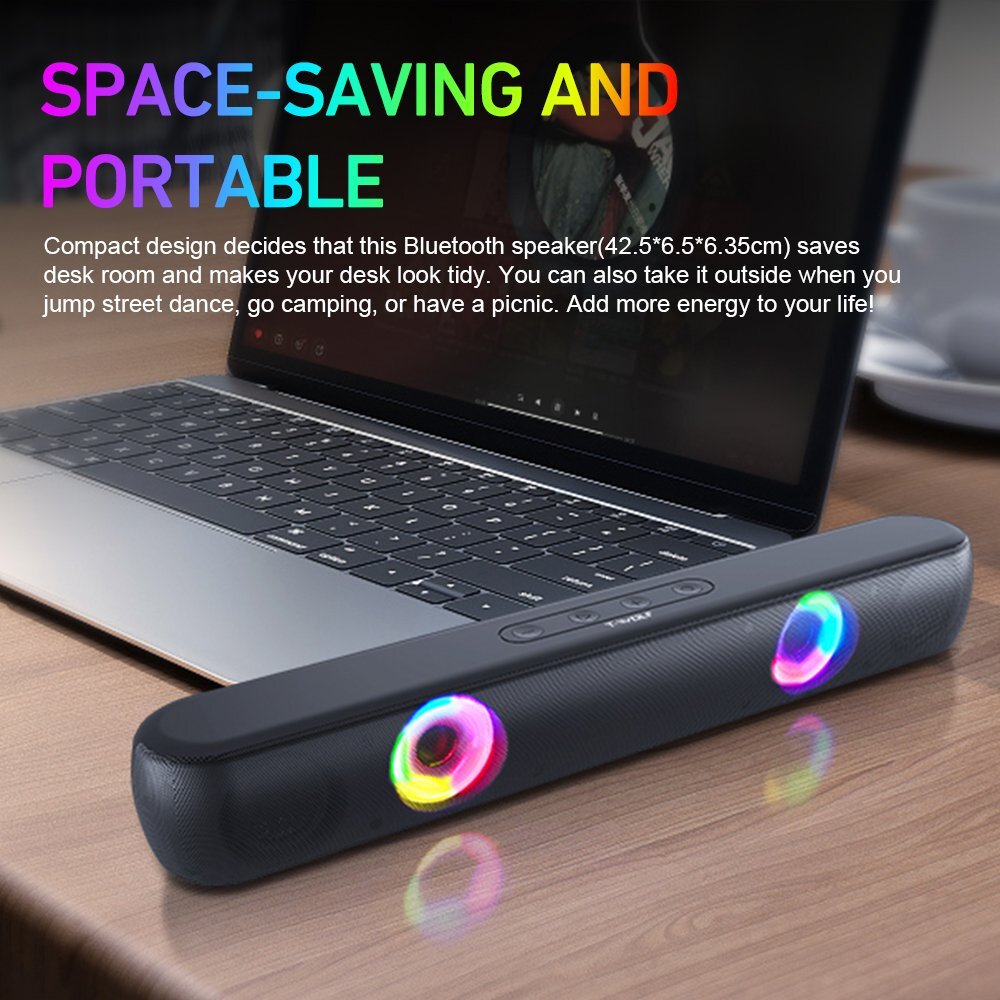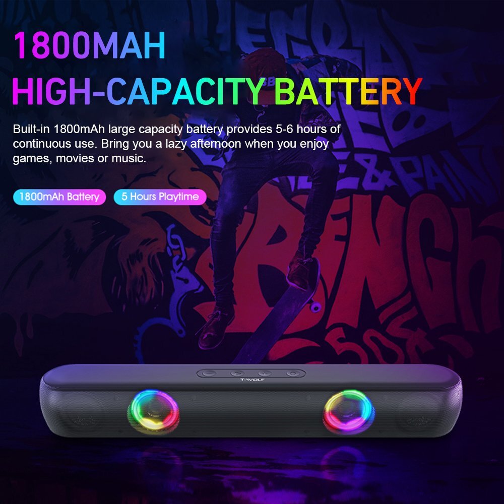2.7 RGB Modes: Our soundbar provides 7 RGB lighting modes, and by pressing the pause button for 2sec, you can switch the light mode. With vibrant RGB lighting, you will find it more enjoyable to watch movies, enjoy music or play games. 3.Bluetooth 5.0 Connection: Featuring BT 5.0 technology, it can wirelessly connect your device such as Windows, Mac OS and Chrome OS laptop, desktop, PC, tablet, Macs, iMacs, TV, phone, MP3, CD players, projector, Switch, PS4, Xbox, etc, as long as your device is Bluetooth-enabled. 5.Multiple Playback Mode: On top of Bluetooth and AUX connection, this desktop soundbar can also be played by TF card, USB drive and FM mode. 6.TWS Function: You will enjoy super stereo sound when you pair 2 speakers together. TWS function enhances listening experience. 7.1800mAh High-capacity Battery: Built-in 1800mAh large capacity battery provides 5-6 hours of continuous use. Bring you a lazy afternoon when you enjoy games, movies or music. 8.Space-saving and Portable: Compact design decides that this Bluetooth speaker(42.5*6.5*6.35cm) saves desk room and makes your desk look tidy. You can also take it outside when you jump street dance, go camping, or have a picnic. Add more energy to your life! Specification: Packing List: