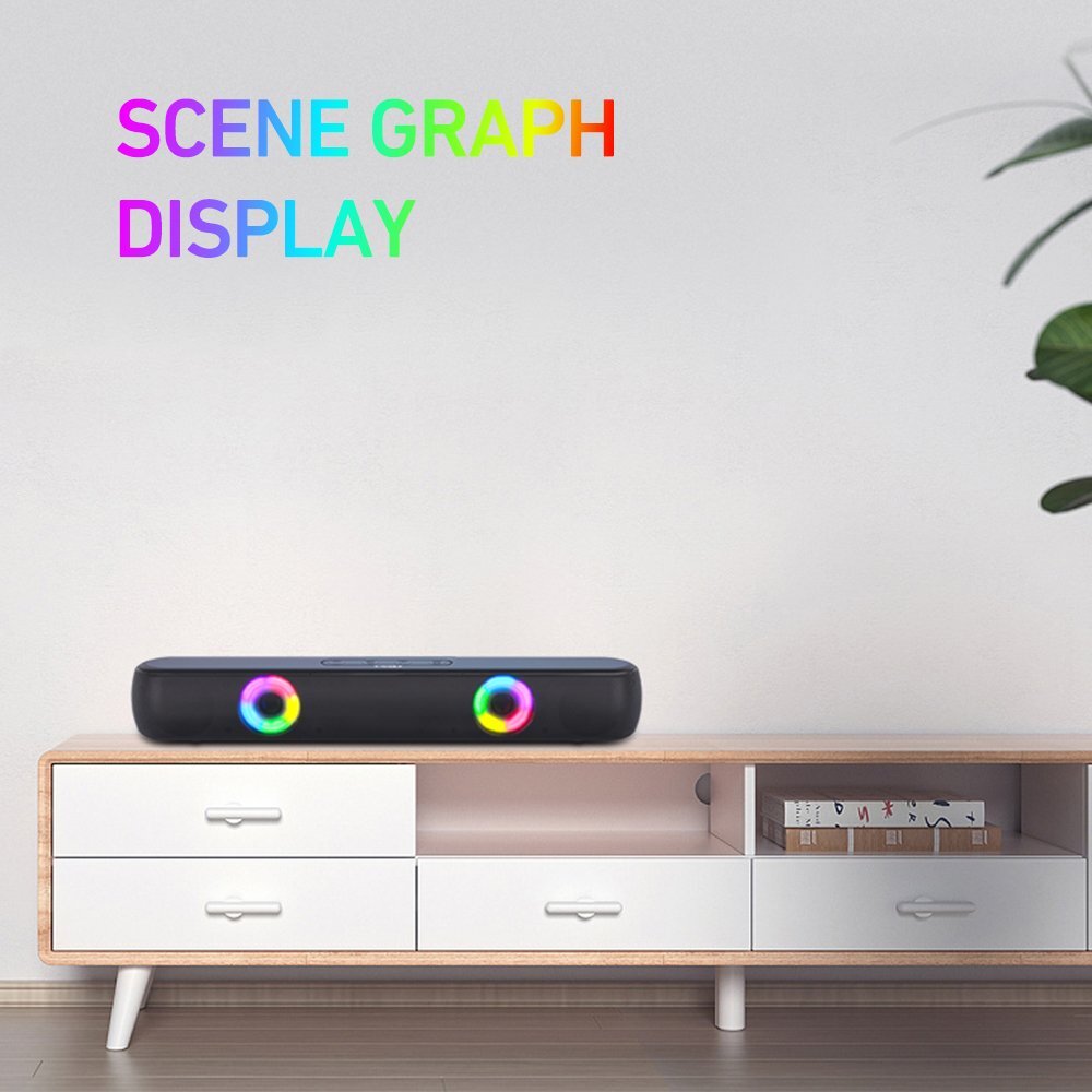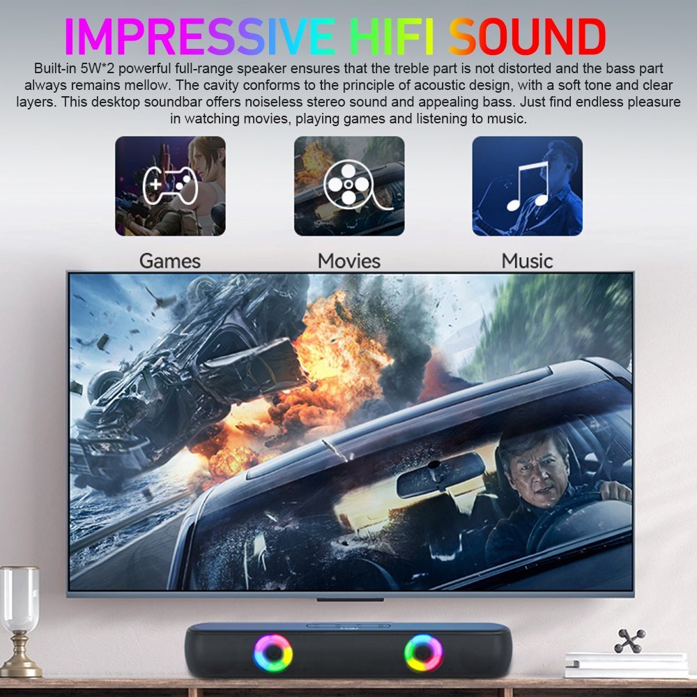 - Equipped with dual 5W full-range speakers, our soundbar provides powerful audio output without distortion. The design focuses on acoustic principles, resulting in clear treble and deep bass that create a captivating listening experience for movies, games, and music.