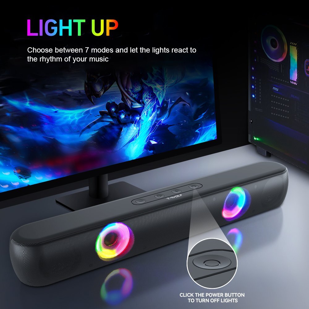 2.7 RGB Modes: Our soundbar provides 7 RGB lighting modes, and by pressing the pause button for 2sec, you can switch the light mode. With vibrant RGB lighting, you will find it more enjoyable to watch movies, enjoy music or play games.