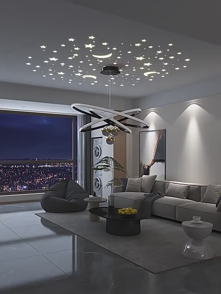 Modern Living Room Ring Chandelier with Galaxy Moon Stars Creative Black/Gold Ring LED Chandelier Light for Bedroom Dining Room