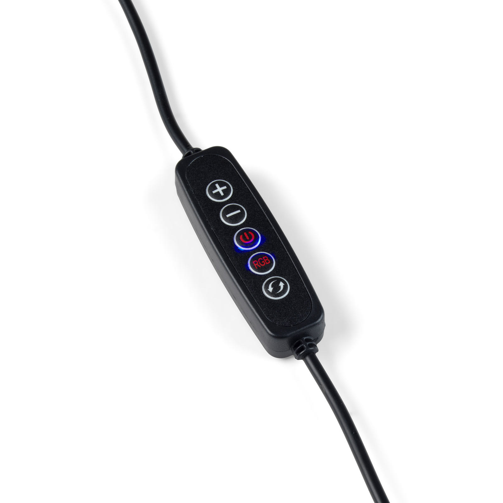- Designed with the user in mind, this free standing selfie light is complete with an easy to use controller and is USB powered.