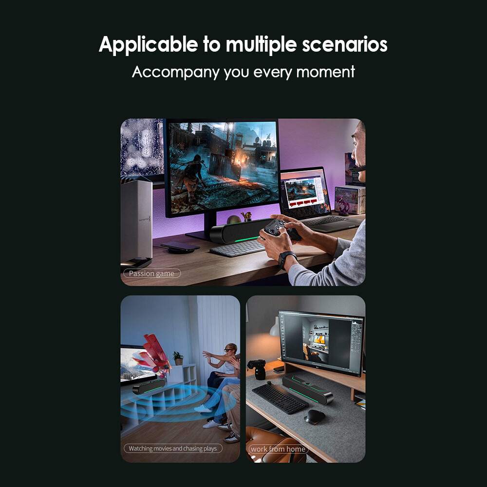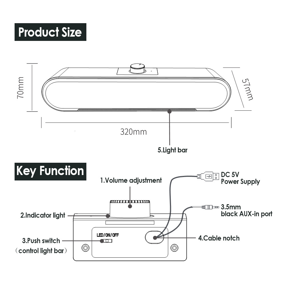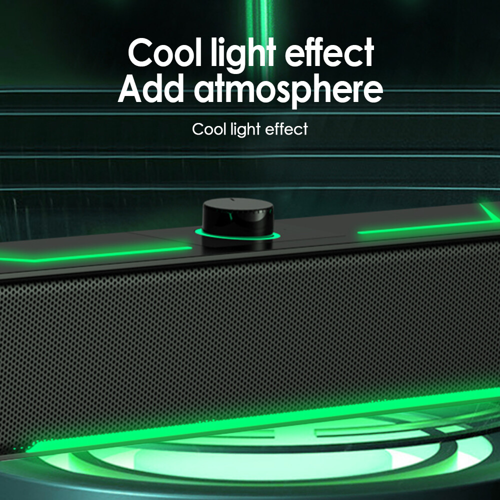 2.LED Light Design: LED light is perfect for your homes, offices and workspaces to enhance happy atmosphere. You can turn on/off the LED light by the control button on the sound bar.