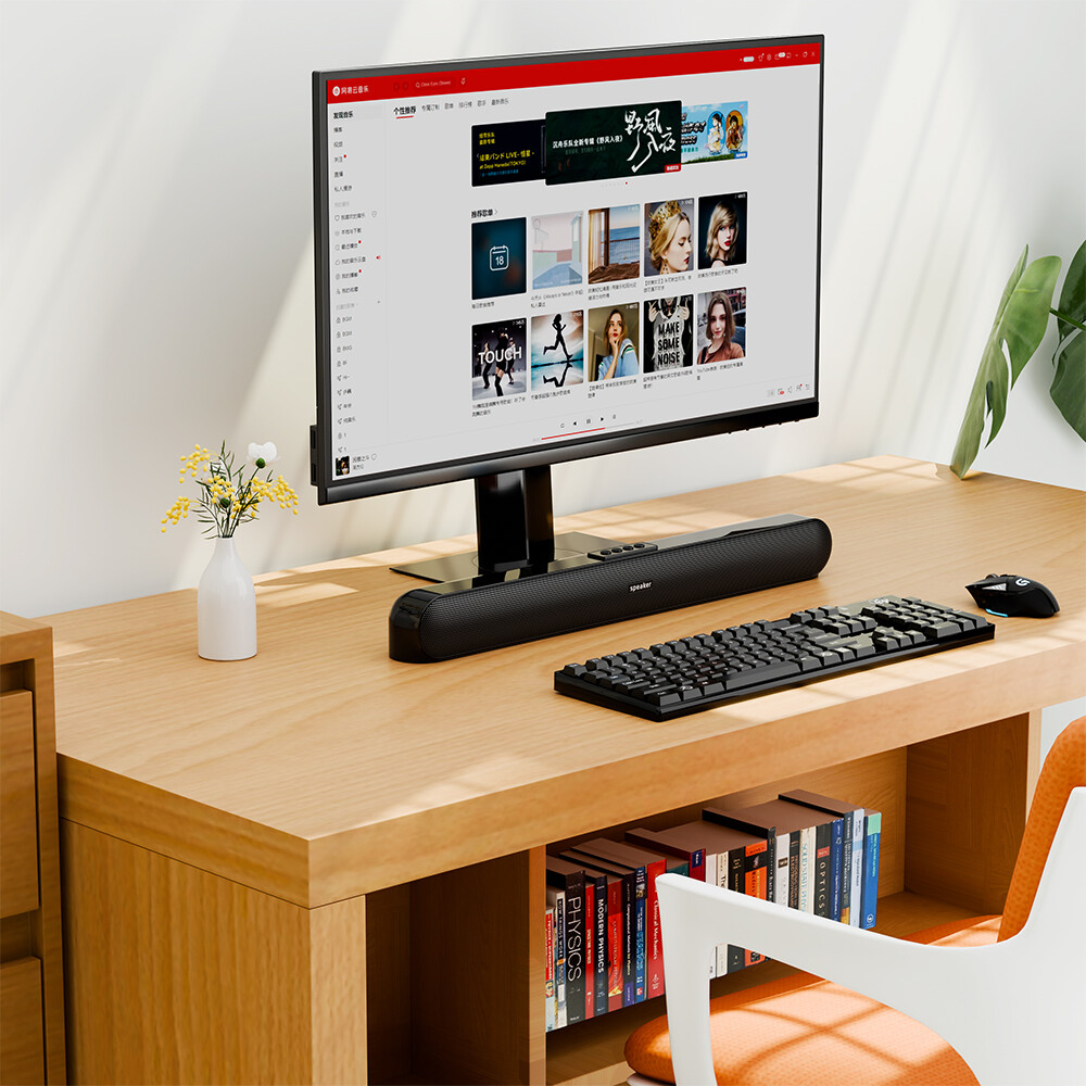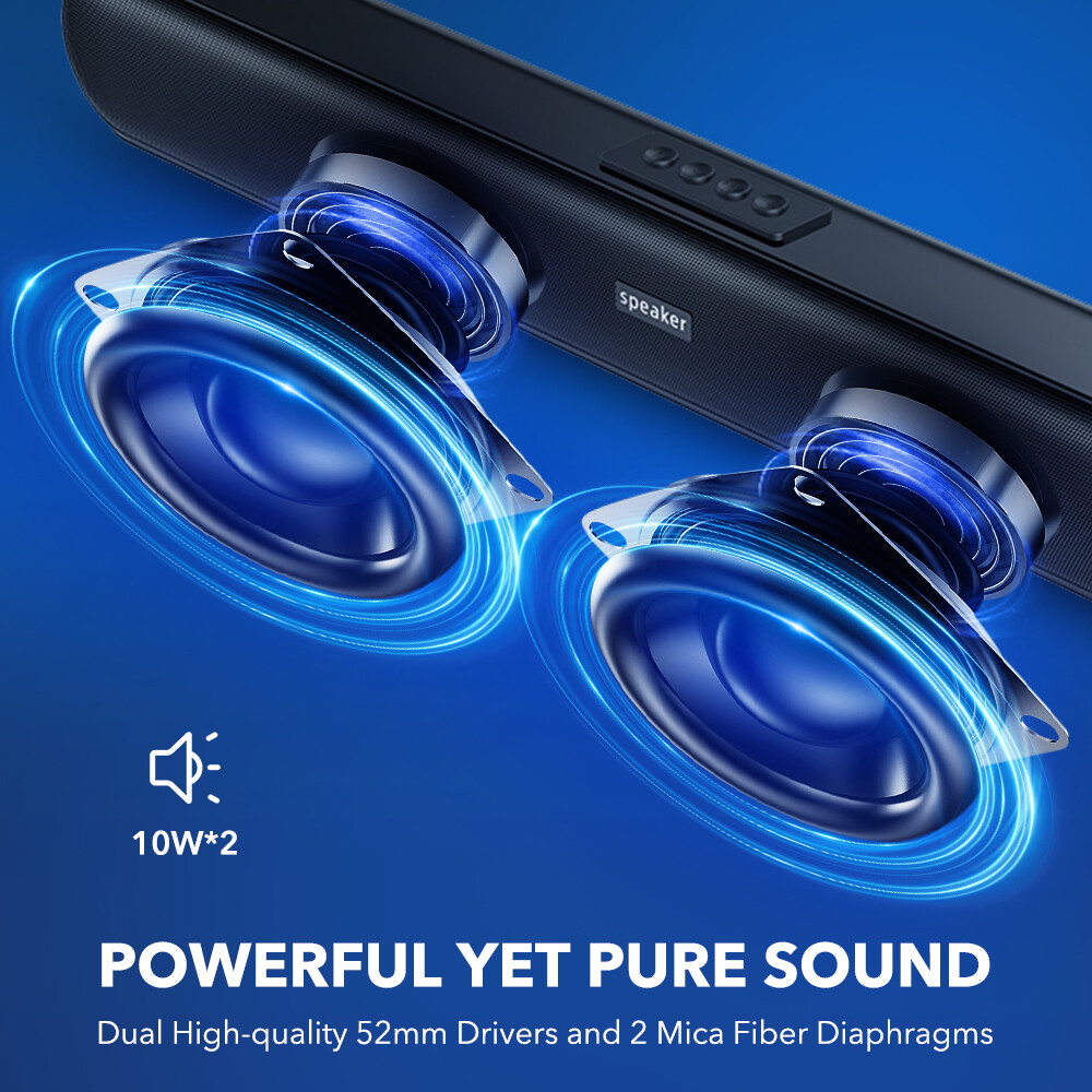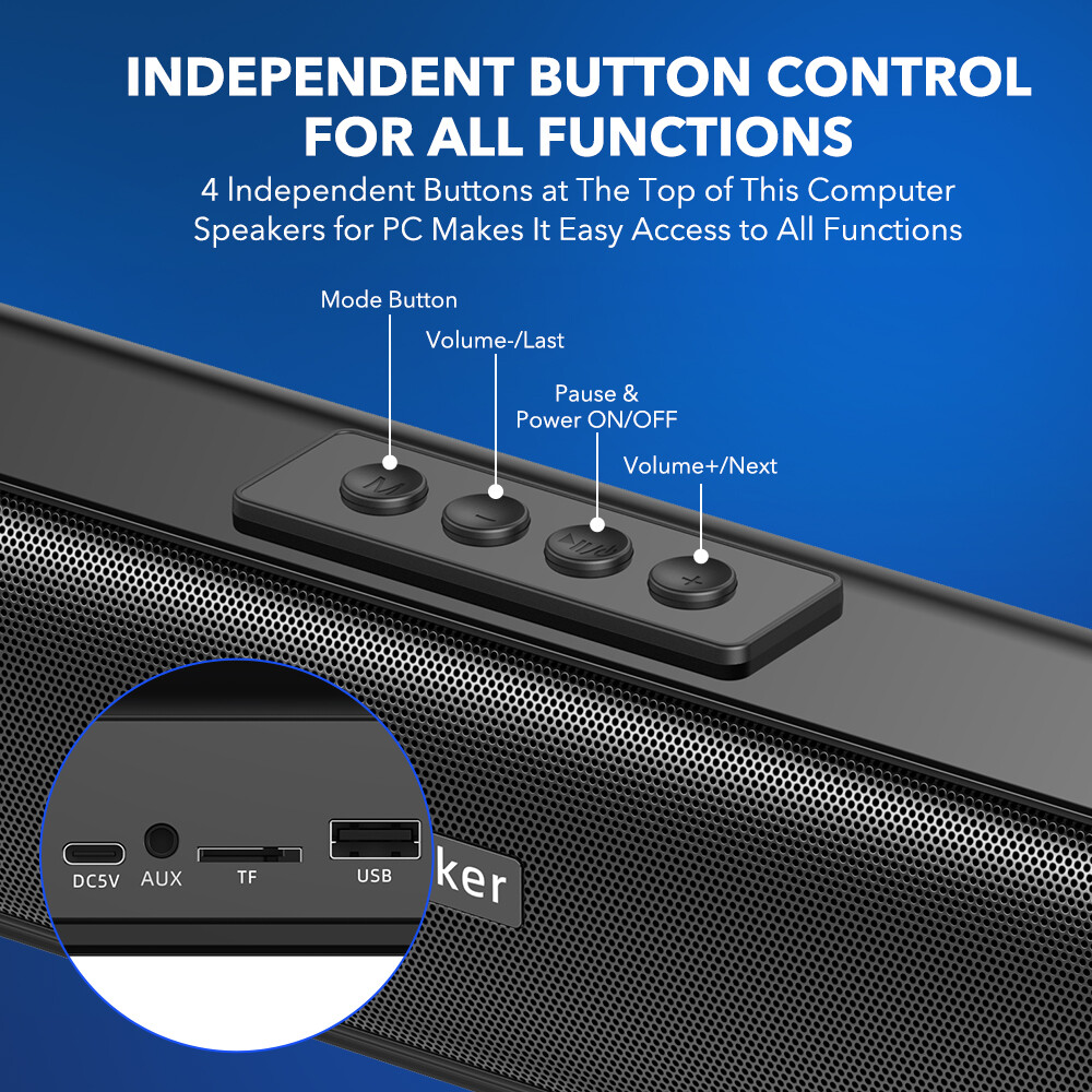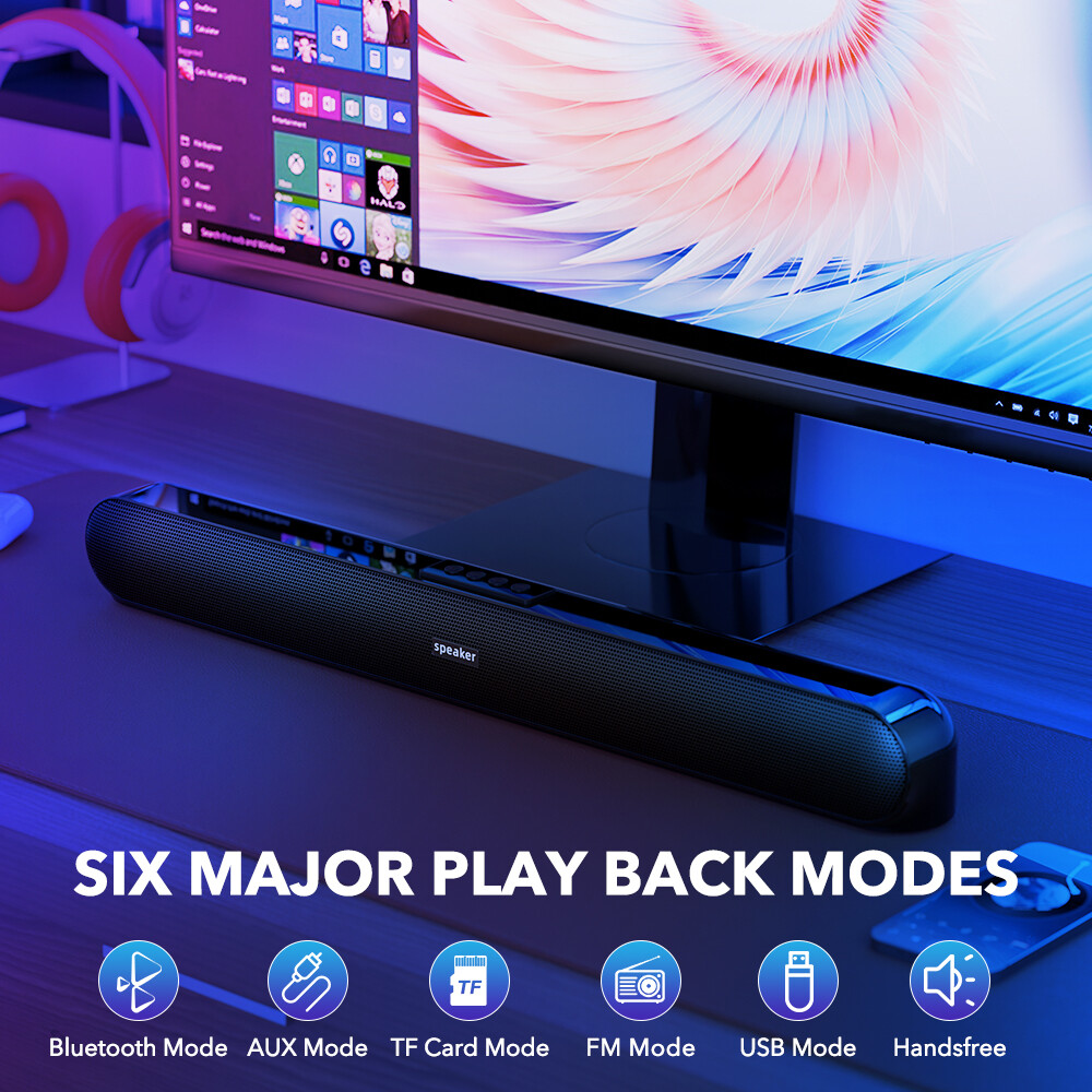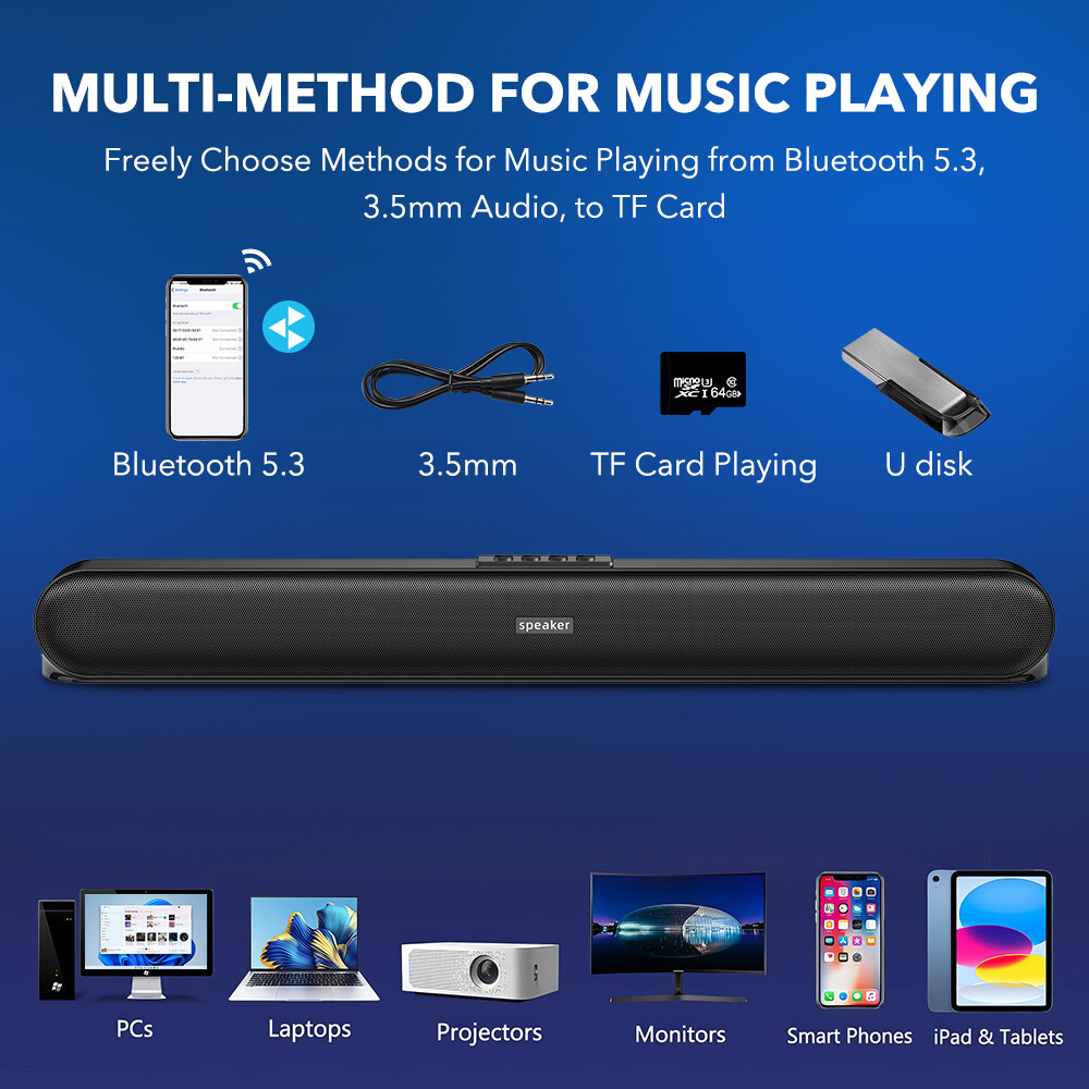 Computer Speakers HiFi Sound Quality Computer Sound Bar Rechargeable PC Speakers Bluetooth Speaker for Desktop Laptops PCs Phones Tablets Xbox Gaming Speakers Features: 2.Stable Connection & Literally Plug and Play: Speaker for pc is equipped with the latest Bluetooth 5.3, More stable, Longer distance, less delay. Bluetooth computer speakers literally plug and play. 3.Built-in Battery: This soundbar comes with a built-in 1200mAh high-capacity battery, providing the freedom to enjoy your music without being tethered to a power source. Whether you're at home, in the office, or on the go, the internal battery ensures uninterrupted music playback. 4.Versatile Connectivity: The soundbar offers a wide range of connectivity options. You can play music through the AUX input, connect wirelessly via Bluetooth for convenience, and even access your favorite tunes from TF cards and USB drives. This versatility ensures you can enjoy your music from various sources. 5.FM Radio Function: This soundbar also features an FM radio function, allowing you to tune in to your favorite radio stations at any time. It expands the soundbar's functionality, providing you with more entertainment options. 6.Hand Free Call: The soundbar is equipped with call handling capabilities, allowing you to answer and end phone calls directly through the speaker. It serves as a convenient communication tool in addition to being a music playback device. Specifications: Package Included: