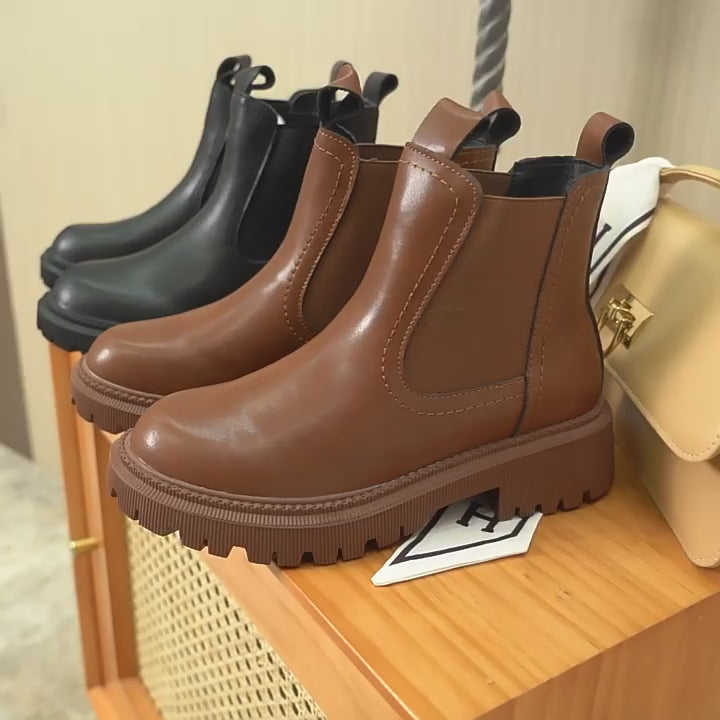 Women's Genuine Leather Chelsea Boots – Winter Retro Ankle Boots with Plush Lining, Low Heel & Rubber Outsole